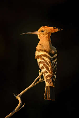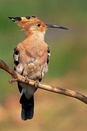 Eurasian hoopoe (Upupa epops) bird on branch seen from the side ith raised crest. One of the most beautiful birds of Europe. Wildlife scene of nature in Europe.