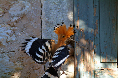 A hoopoe is feeding the offspring in the nest located in the old house of Brijuni National Park