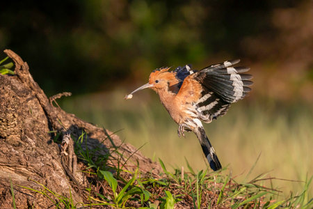 Eurasian hoopoe (Upupa epops) bird with beetle insect in beak and raised crest. One of the most beautiful birds of Europe aproaching nesting site. Wildlife scene of nature in Europe.