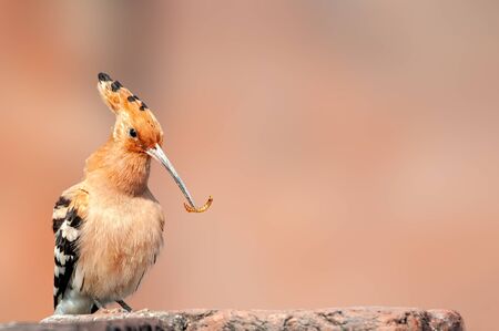 Common hoopoe on a brick wall with caterpillar in its beak