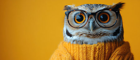 Owl wearing glasses and a sweater, vibrant yellow background, portraitstyle closeup