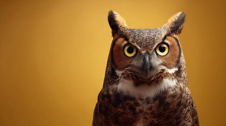 A striking portrait features a great horned owl, its piercing eyes gazing forward. The bird is set against a solid golden background, emphasizing its intricate feather patterns of browns and whites. The image displays a well-lit studio environment, ideal for various editorial and commercial applications.