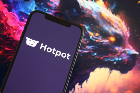KYIV, UKRAINE - MARCH 17, 2024 Hotpot logo on iPhone display screen with background of artificial intelligence futuristic ai generated image close up