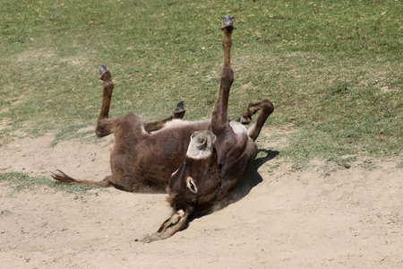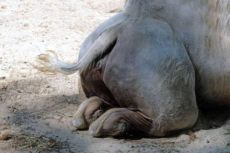 Lying camel's ass close-up. The camel lies on the sand, the rear part with a tail and legs. The back of a lying camel.