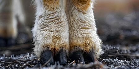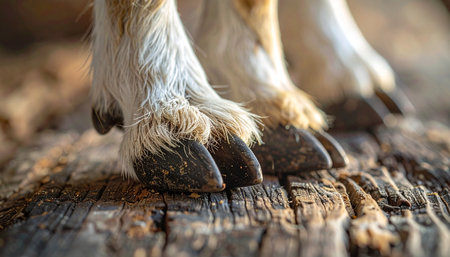 A detailed close-up captures the texture and form of a goats cloven hooves standing firmly on a weathered wooden floor. The image evokes a sense of groundedness, rustic simplicity, and the quiet, authentic life of a farm animal.