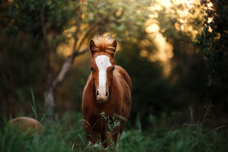 A pretty foal stands in a Summer paddock, Foal playing in a meadow