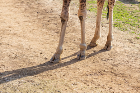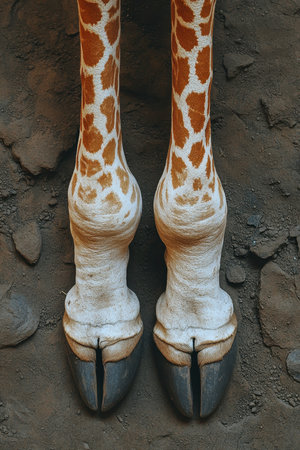 Close-up of a giraffe's legs reveals distinct coat patterns and hoof structure, highlighting the animal's elegance while standing on earthy ground in a natural habitat