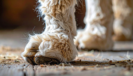 A detailed, low-angle view captures the unique, two-toed feet of an alpaca standing quietly on the warm wooden planks of a rustic barn floor. The soft light highlights the texture of its thick wool, evoking the simple authenticity of farm life.
