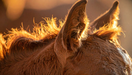 A close-up detail shot captures the delicate fur of a horses ears, beautifully backlit by the warm, golden light of a sunrise or sunset. The glowing halo effect creates a serene and peaceful mood, evoking feelings of tranquility and the quiet beauty of rural life in a stable.