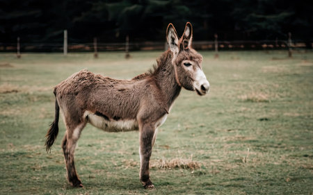 A beautiful grayish donkey on a green pasture in nature looking at camera