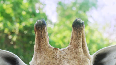In the frame, a close-up of a giraffes face with brown spots and small horns is shown. A panorama from the eyes to the top of the head with small horns. Animal life in the wild or in the zoo