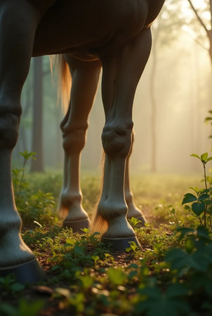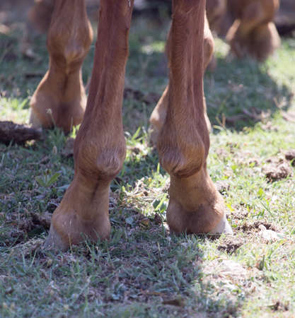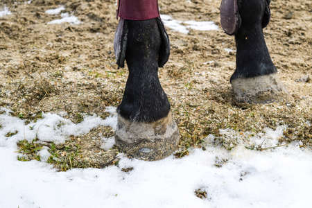 The front legs of a horse are shown with the hooves visible. The hooves have a shiny appearance
