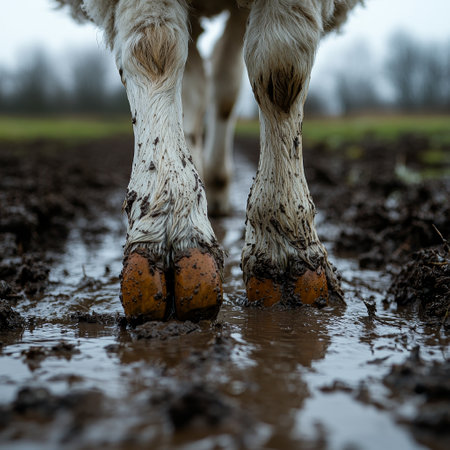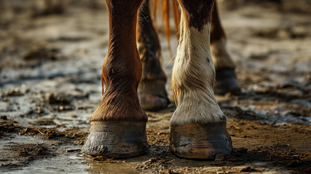 A close view of a horse's hooves standing in the mud, highlighting the details and strength of the equine limbs.