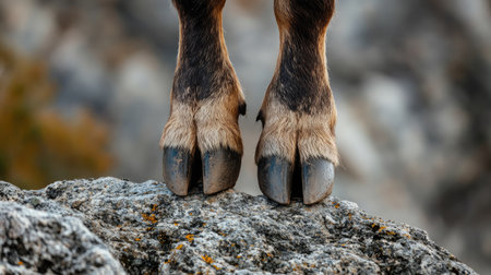 A close-up of a male Iberian ibex's hooves gripping a rocky ledge, highlighting its strength and dexterity in its natural habitat.