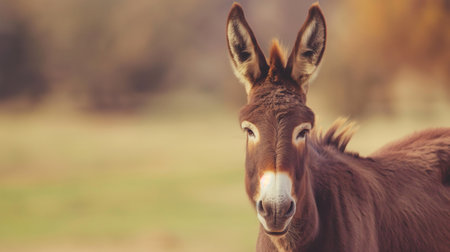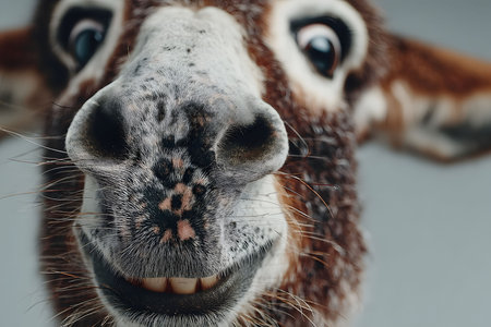 A whimsical close-up of a donkey's face highlights its playful and curious expression. the image showcases detailed fur textures and expressive eyes, capturing the charm and character of the donkey in a humorous and engaging way. Generative AI