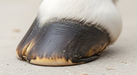 A detailed close-up of a horse's hoof resting on the ground. The image shows the transition from the white hair on the lower leg to the dark, black hoof wall. The texture of the hoof, including natural growth rings, is clearly visible, focusing on equine anatomy.