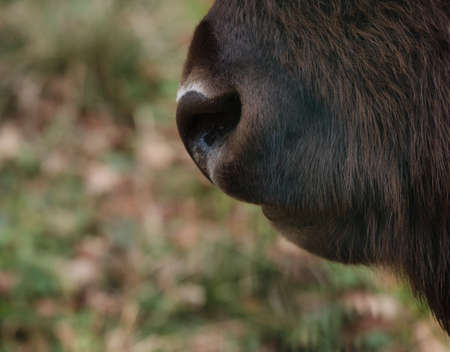 Close-up of bison's nose against backdrop of an autumn forest. In Prioksko-Terrasny Reserve