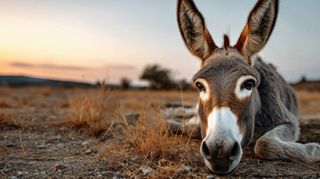 A captivating close-up view of a donkey lying on a dry terrain during sunset, showcasing its expressive features and serene surroundings, filled with warm tones.