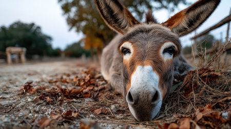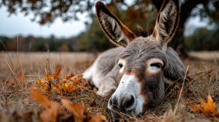 A serene close-up of a donkey lying down surrounded by autumn leaves, showcasing its gentle expression in a peaceful outdoor setting. A perfect capture of tranquility in nature.