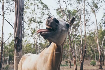 Lowangle view capturing the detailed expression of a horse with an open mouth against a blue sky background