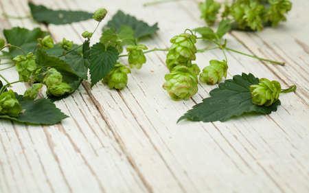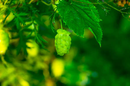 Fresh hop cones for making beer and bread close-up, agricultural background. Selective focus. Copy Space