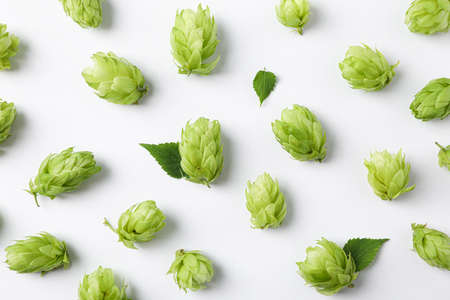 Green fresh hop cones for making beer and bread closeup, agricultural background.