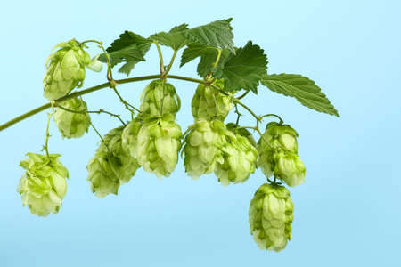 Green fresh hop cones for making beer and bread closeup , blue toned, agricultural background