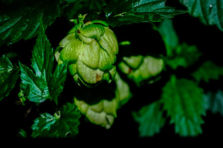 This striking image showcases an elegant arrangement of fresh hop cones and vibrant green leaves against a dark backdrop, highlighting the beauty of nature.