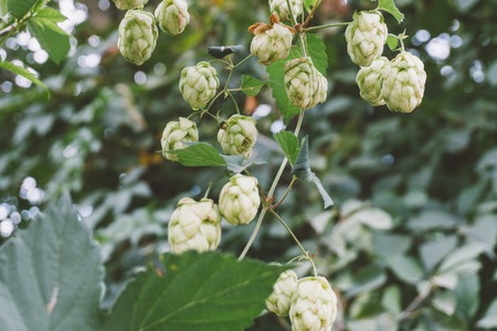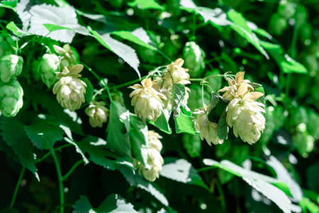 Hop plant, cones and foliage closeup. A medicinal plant, a symbol of fertility, well-being and good luck. Used in brewing. Depressant