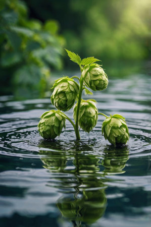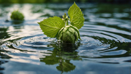 Fresh green hop cones rest on the water's surface, creating gentle ripples and a tranquil scene Perfect for brewing and agricultural imagery.