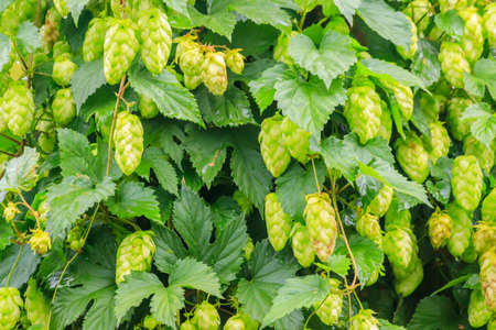 Closeup of ripe hop cones in the hop field. Beer production material.