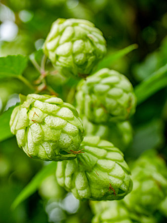 Close-up of green hops growing in a lush garden on a sunny day symbolizing natural growth and agriculture