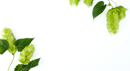 banner of Fresh green hop Cones for brewing beer in close-up.