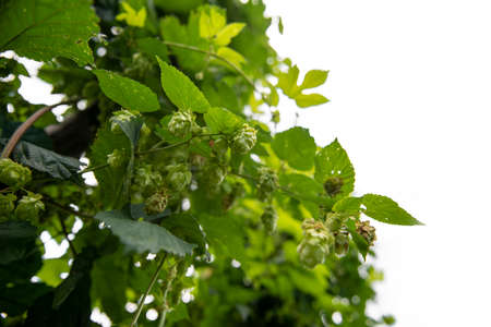 Hop plant with hop cones against the blue sky. Growing humulus, or hop plant. Hop plants