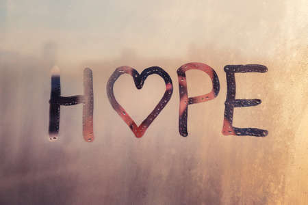 Handwritten word Hope with heart shape on misted sunset glass on window flooded with raindrops