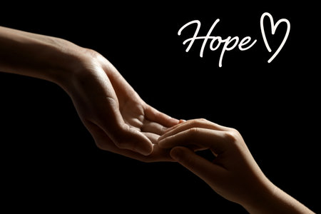 Extreme close-up of the cupped hands of a child holding a heart shaped black pebble with text Hope. Engraved concept for faith, love, spirituality and religion. Generative Ai.