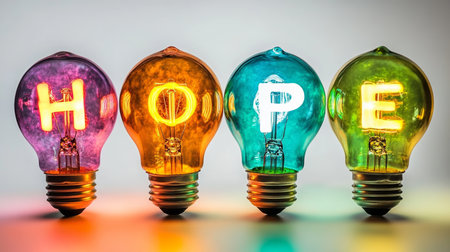 A Vibrant Message of Hope Multicolored Light Bulbs Spell Out HOPE on a Reflective Surface