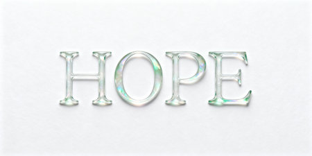 The word HOPE displayed in elegant, shiny iridescent letters on a clean white background. The minimalist design emphasizes positivity and inspiration, with space for text.