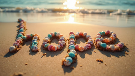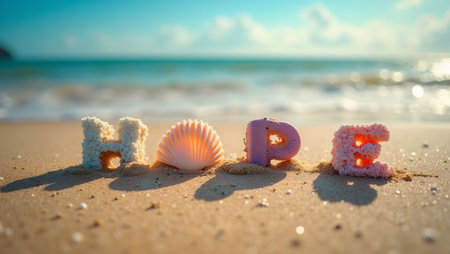 Word hope spelled with colorful seashells on sandy beach