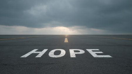 A road stretches into the distance under a dramatic sky, featuring the word 'Hope' painted in white on the asphalt, symbolizing new beginnings and inspiration.