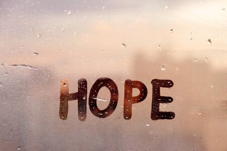 Foggy glass on window with written finger word yellow color Hope concept photo with copy space on blue and warm background