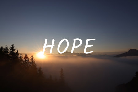 This uplifting image features the word HOPE spelled out against a beautiful sunset over the ocean, radiating positivity and inspiration for new beginnings.