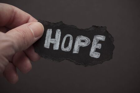 Black torn piece of paper with word Hope in hand against black background.