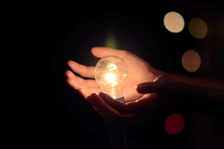 incandescent light bulb in a hand on black background