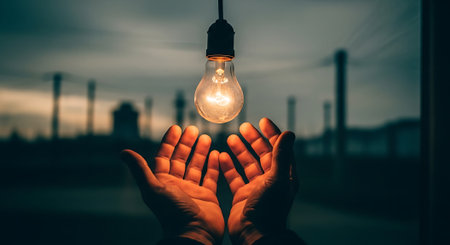 LED light bulb is lying in the bed, hands touching. Symbol for ideas and innovation. Spot lights in the blurry background.