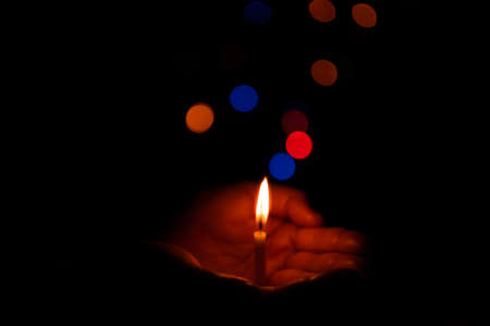 A candle burns in the dark. The light from the candle illuminates the palm. A woman's hand supports the candle and shelters it from the wind. Dark background.