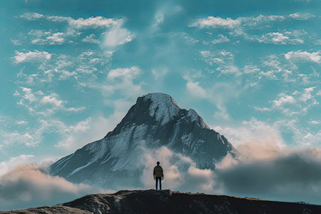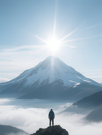 Rear view of a solitary person on a snow covered mountain summit, gazing at a breathtaking panorama of peaks rising above a sea of clouds on a clear winter day.