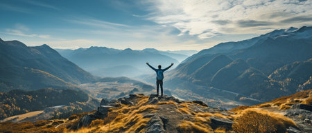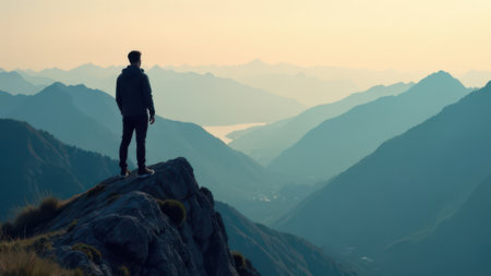 A silhouetted hiker stands triumphantly on a mountain peak, embracing the breathtaking sunrise view. The landscape features majestic mountains and a serene valley below.