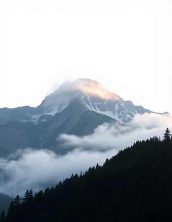 A stunning view of a snow-capped mountain rising majestically above a misty forest, capturing the serene beauty of nature at dawn. The peaceful landscape invites exploration and adventure.