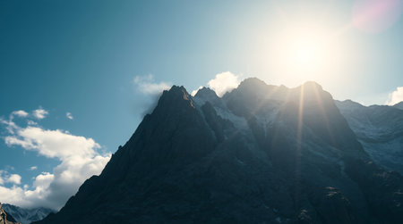 Golden rays of sunlight filter through mountain peaks at sunrise, casting a serene glow over the tranquil landscape, enhancing the natural beauty.